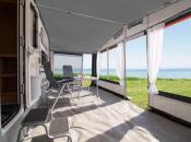 détachable et amovible, porte à gauche du centre pouvant être roulée en hauteur, fenêtres munies de rideaux, ourlets creux horizontaux sous les fenêtres destinés à recevoir les barres anti-tempête ou les tubes de véranda, pour la taille 16+17, la fenêtre gauche de la paroi frontale est séparée en 2 fenêtres.