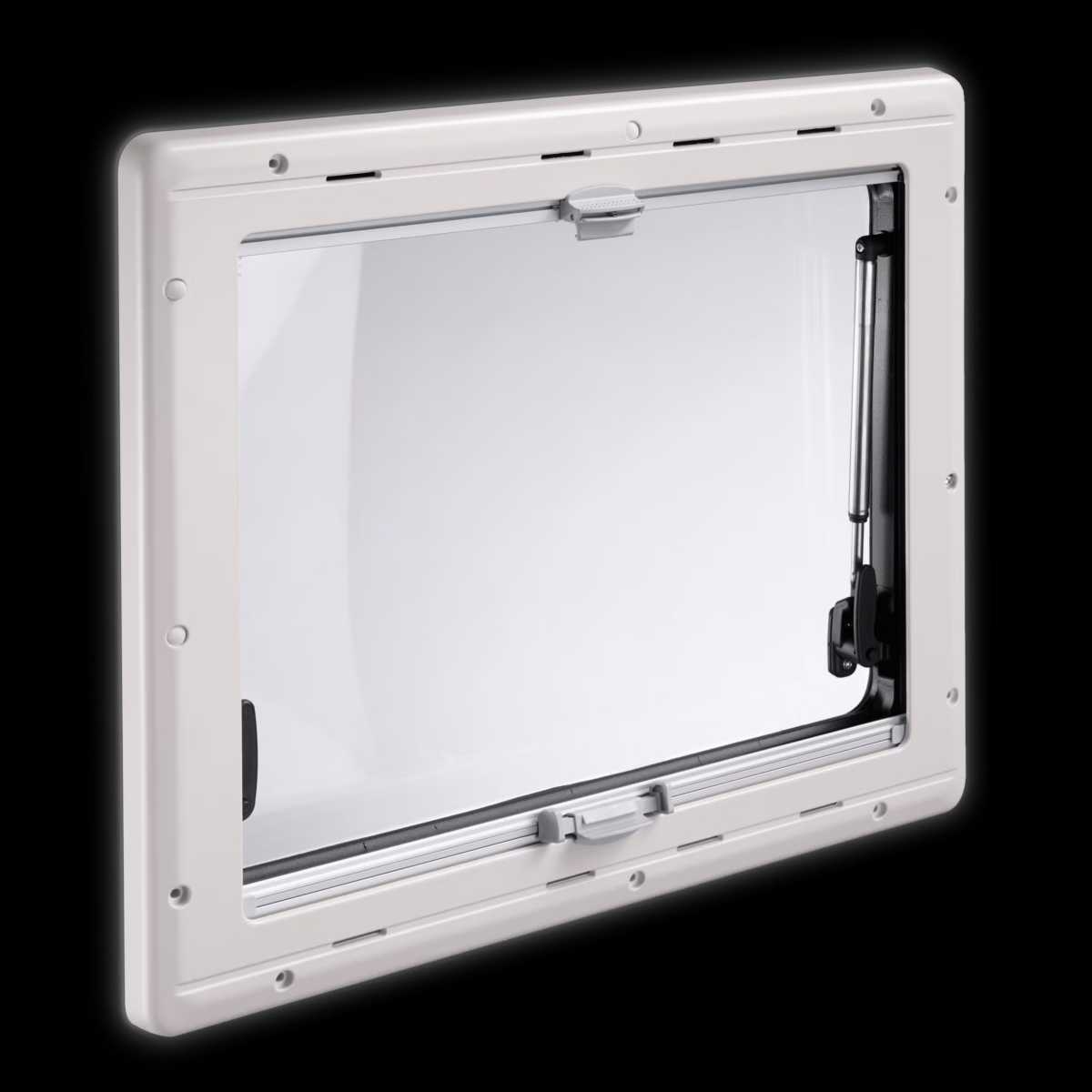 Baie structurée Dometic S4 en polyuréthane avec contre cadre équipé d'un store enrouleur intégré et d'une moustiquaire pour camping-cars, fourgons aménagés et caravanes.