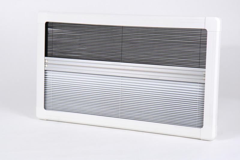 - Composé d'un store plissé occultant et d'une moustiquaire également plissée.