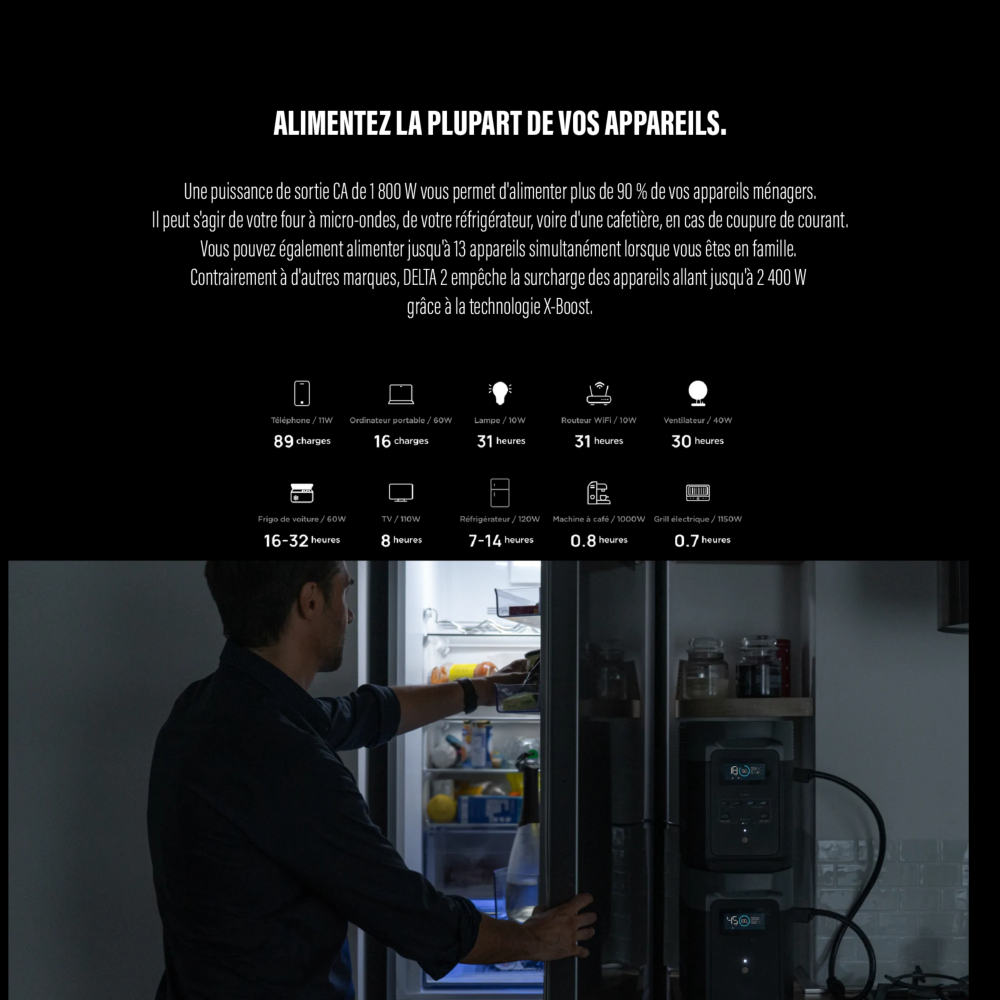 Une puissance de sortie CA de 1 800 W vous permet d'alimenter plus de 90 % de vos appareils ménagers. Il peut s'agir de votre four à micro-ondes, de votre réfrigérateur, voire d'une cafetière, en cas de coupure de courant. Vous pouvez également alimenter jusqu'à 13 appareils simultanément lorsque vous êtes en famille. Contrairement à d'autres marques, DELTA 2 empêche la surcharge des appareils allant jusqu'à 2 400 W grâce à la technologie X-Boost.