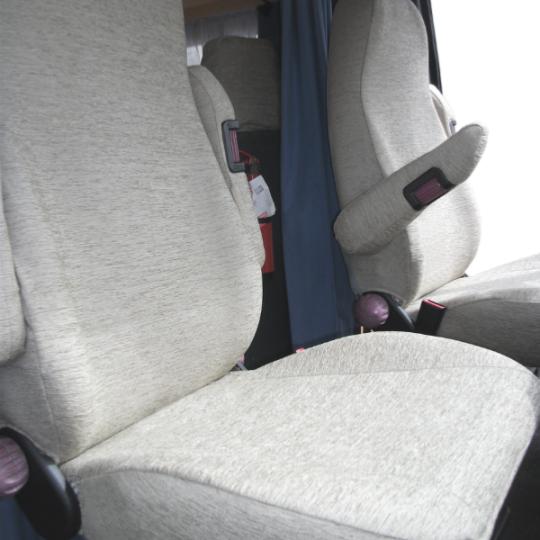 Housses haut de gamme spécialement conçues pour les sièges avant des camping-cars de type intégraux, avec sièges AGUTI dont la ceinture est intégrée au siège.