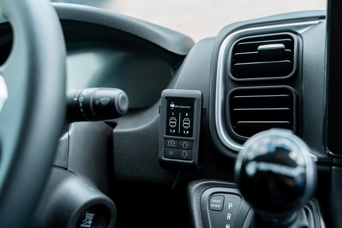 Ces coussins d'air renforcent l'arrière des fourgons équipés de suspensions à lames. L'afficheur numérique permet de visualiser et d'ajuster indépendamment la pression dans chaque coussin, offrant un réglage précis de la dureté et de la hauteur selon le chargement ou l'inclinaison du véhicule sur terrain irrégulier.