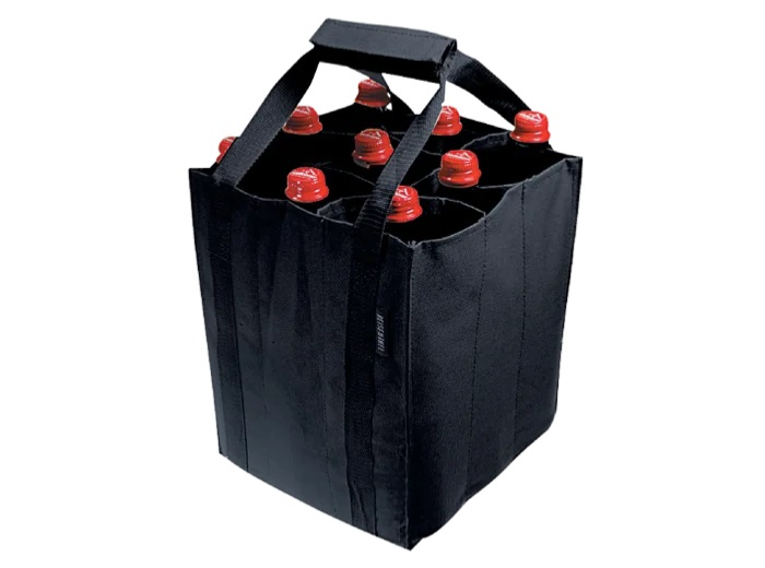 Sacs avec 9 compartiments pour transporter 9 bouteilles de 0,75 l. 2 bandouillères renforcées jointes par bandes auto-agrippantes. Polyester de haute qualité, déperlant. Sacs repliables.