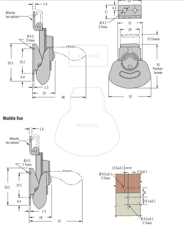Dimensions du loquet: 52 x 55 x épaisseur 19mm
