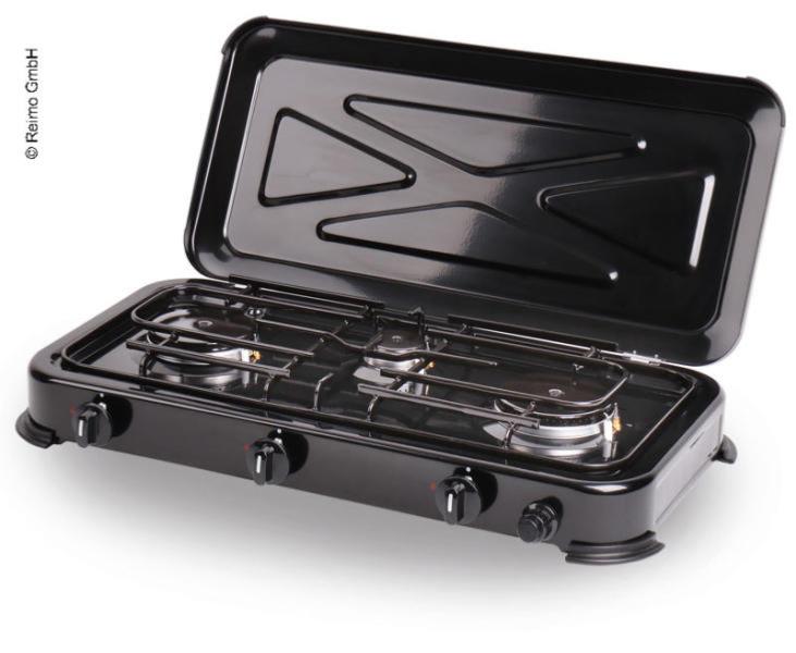 • Conçue pour le camping-car, fourgon aménagé ou le plein air au camping, cette nouvelle cuisinière à gaz 3 feux de CAMP4 présente beaucoup d'atouts pour être une cuisinière haut de gamme. En effet, elle possède des pieds anti-dérapant, un système d'allumage piézo, une sécurité thermocouple par feu et un couvercle qui fait office de paravent. En option, des pare-flammes latéraux (référence 70795).