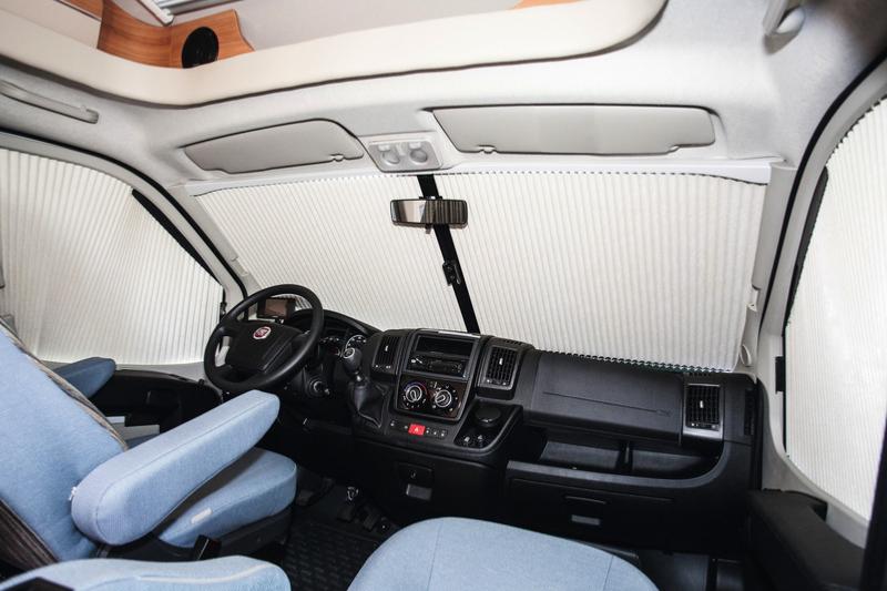 Dormez bien ! Avec son nouveau système d'obscurcissement REMIfront IV, REMIS a développé la solution adaptée aux cabines de chauffeur dans Fiat Ducato X290, Citroen Jumper, Peugeot Boxer, Opel Movano (à partir de l'année de construction 2021) sans détecteur de pluie.