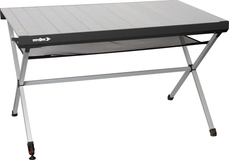 Table en aluminium avec plateau roulant et cadre pliant spécial, facile à installer.