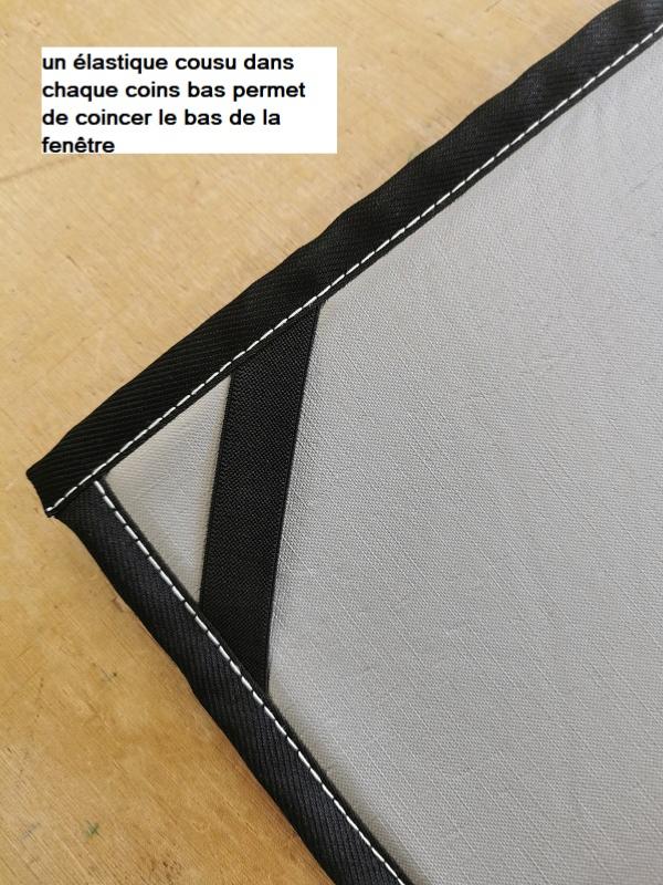 - Le montage se fait simplement par deux élastiques appliqués sur la partie en bas de la vitre et fermeture par velcro dans la partie haute.